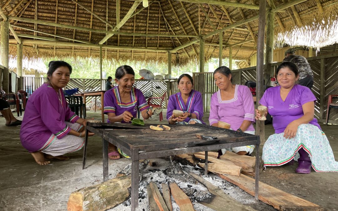 Foto principal: Miembros de Sani Warmi comparten chicha y alimentos tradicionales alrededor de la brasa. Foto: Ana Cristina Alvarado